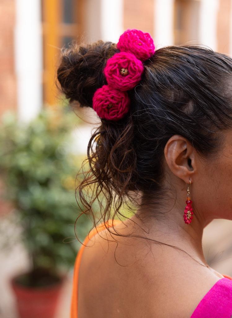 Adorn yourself with the beauty of our handcrafted crocheted Floral Gajra. Intricately crafted with love and care, these delicate floral garlands are perfect for adding a touch of elegance to your outfits. Whether for special occasions or everyday wear, our crocheted Floral Gajra is sure to make a statement. Shop now and embrace the timeless charm of these handcrafted adjustable size Floral Gajra. Easy to use, washable, reusable. Can also double up as bracelet or anklet. Let the 'Flower Girl' in you run wild!